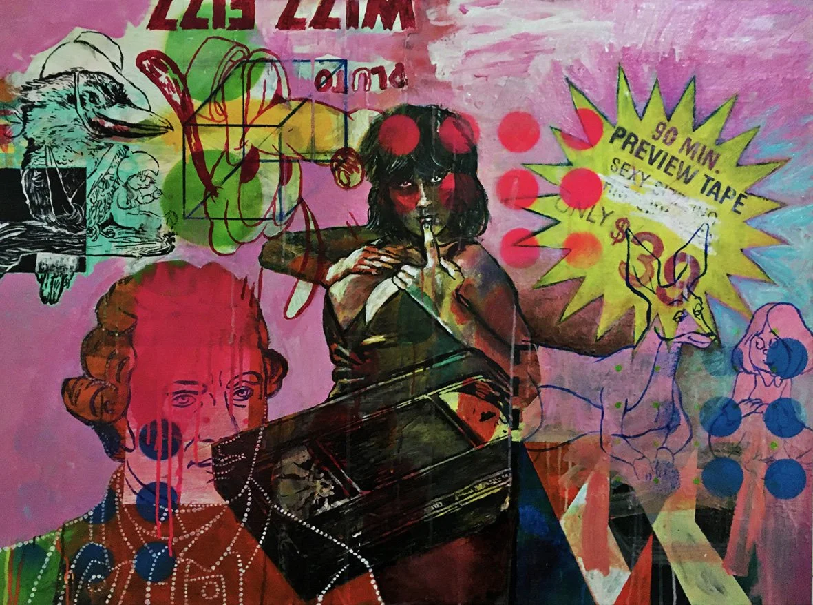 The Australasian Post was read by millions at the height of its popularity in the 1970s, and featured a uniquely Australian mix of scandal, sensationalism, human interest stories, fashion, politics, culture and entertainment, being the staple of barber shops across the country, such as where the artist first encountered them as a child at a former barber shop only a few shops away from the where the Art Gallery of Ballarat stands today. The figures appear in fragmented arrangements, at once, ripped from their original contexts and composed into an ironic juxtaposition to each other, like a kind of vintage television 'channel-hopping.'